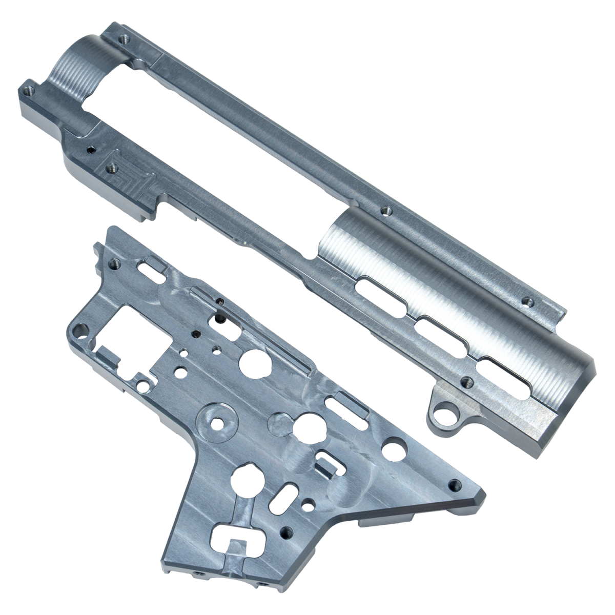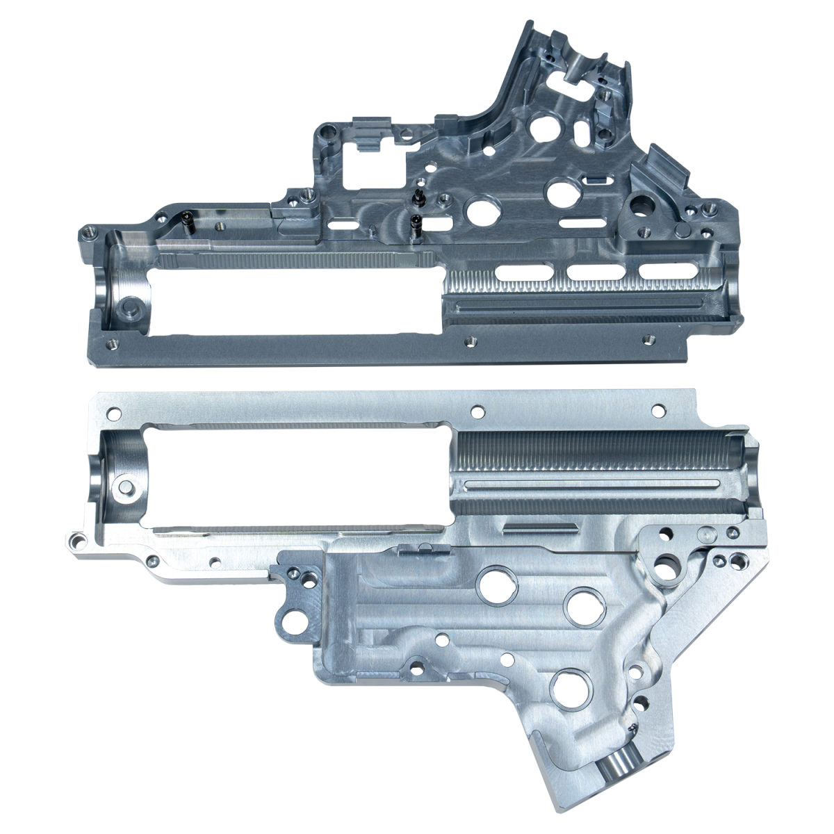 純正の亜鉛メカボックスに比べて飛躍的に強度、精度が向上し単体重量は約178gと軽量化にも貢献します。また、各部が肉厚に補強されていて構造的な強化も施されています。スプリングは専用のガイドを用いたクイックチェンジ構造で後部からワンタッチで交換できるため、調整が容易です。Ver.2の悩み所だった配線スペースが大きくなっており最大12AWG(3.5sq)のシリコンコードが通せるようになっているのでハイサイクルチューンなど、高負荷の使用に最適です。