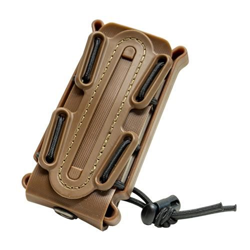 特殊部隊や海兵隊などの軍や警察などの法執行機関でも使われG-CODEスタイルのマガジンポーチです。サイドにあるバンジーコードでテンションと幅を調節できる仕様になっておりGLOCKやHi-CAPA、M1911のような細いマガジンにも対応します。ラバー素材でできているのでポーチの蓋がなくても十分に保持することができる上、マガジンにも傷がつきにくくなっています。背面のMOLLEクリップでベストやベルトに取り付けることが出来ます。