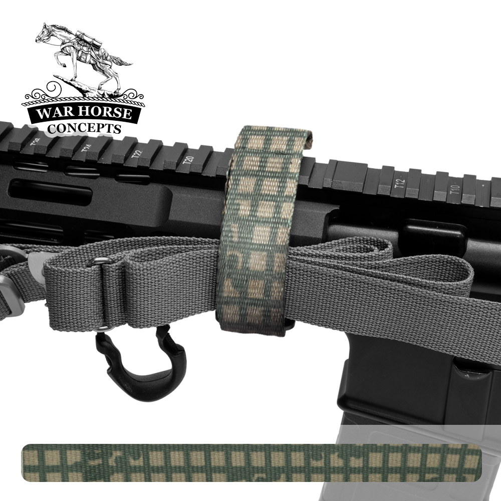 スリングを引っ張るだけで展開可能で、ハンドガードやストックに取り付けて使用します。