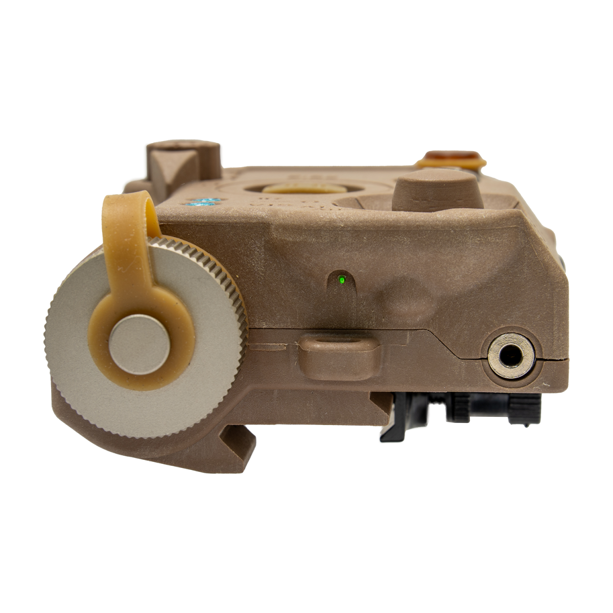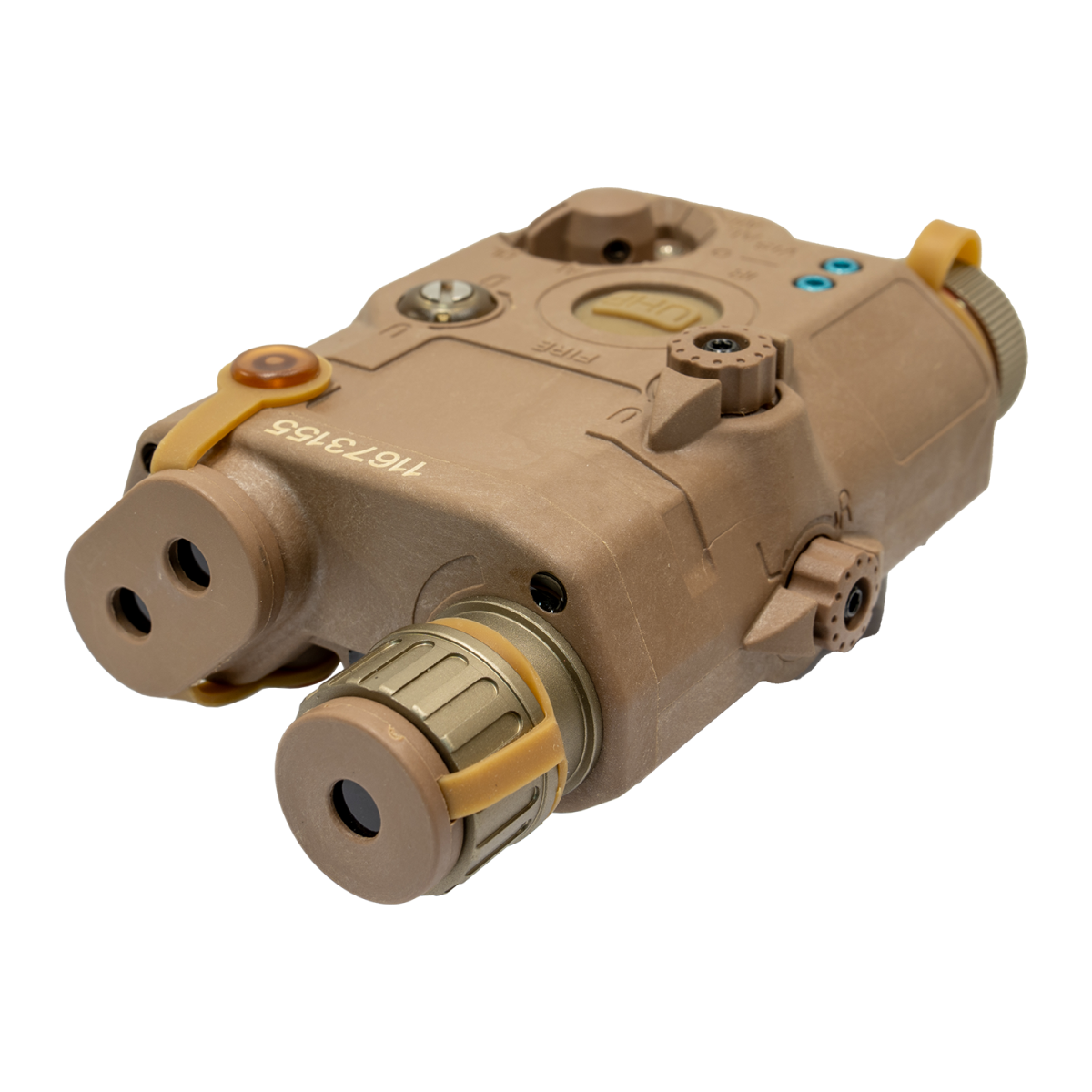 軍などで使われるレーザーモジュールPEQ-15 LA-5C UHPです。PEQ15の高出力バージョンLA5モデルをさらに出力向上させたUHP(ULTRA HIGH POWER)がモデルとなっております。PEQ15に比べてIRライトの調整ダイヤルが大きくなっている点や中央のボタンにあるUHP刻印が特徴です。付属のバッテリーキャップはCではなくAタイプになります。