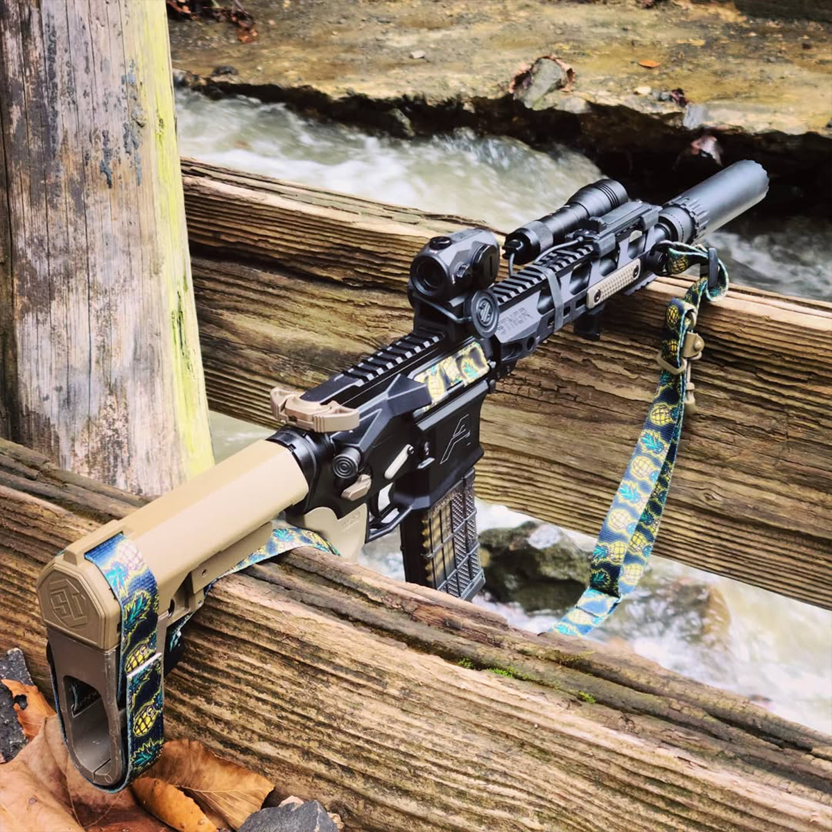 タブを引っ張りながら前後にスライドすることで瞬時に長さを調節できる2点式スリングです。
