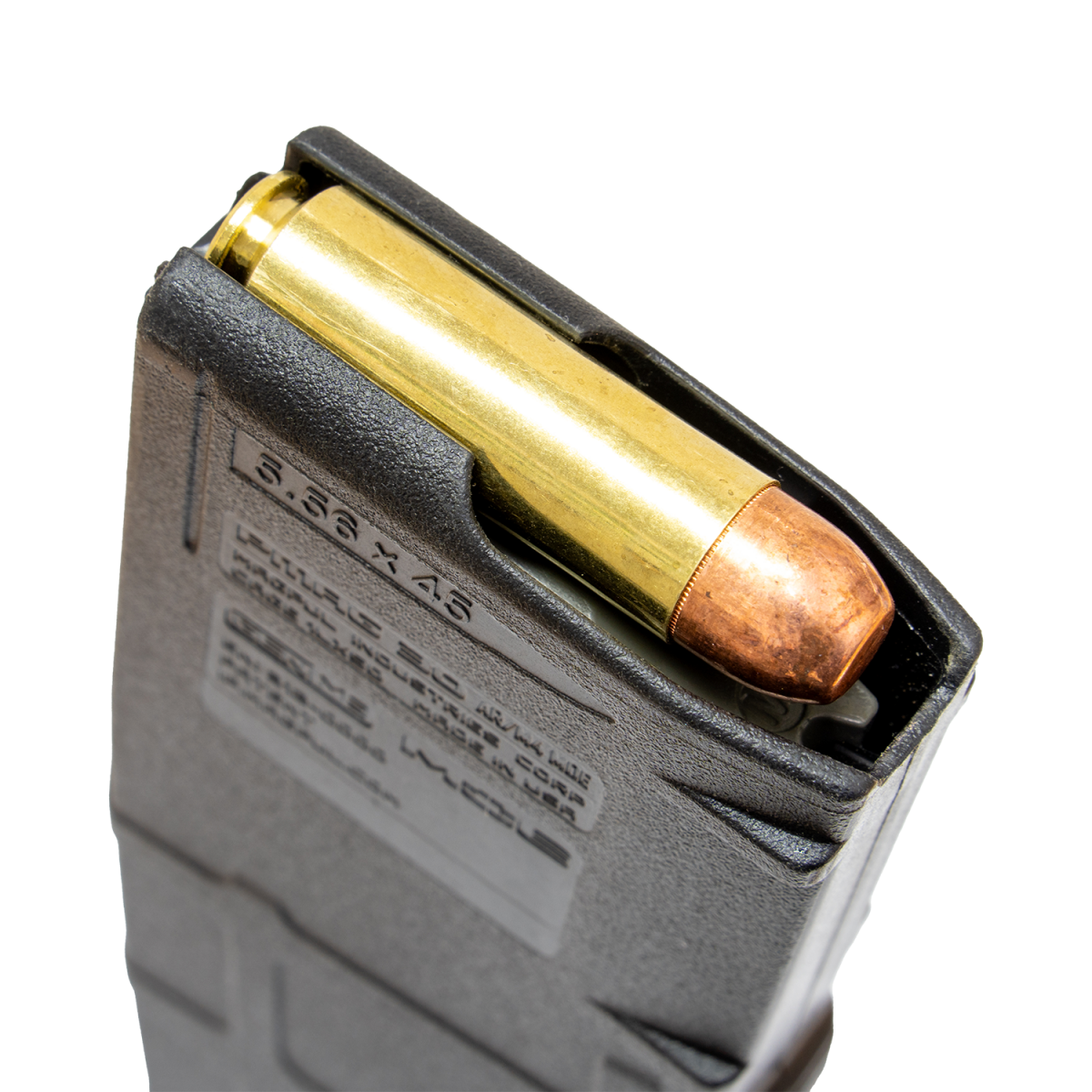 通常のAR-15用マガジンはダブルカラムで弾倉に5.56mm弾を装填しますが、こちらの弾薬はとても大きいためシングルカラムで使用します。専用マガジンも発売されていますが、通常のAR-15用マガジンでも使用可能な特異な弾丸です。5.56mmでは30発装填できますが50 Beowulfの場合は10発がフルロードになります。