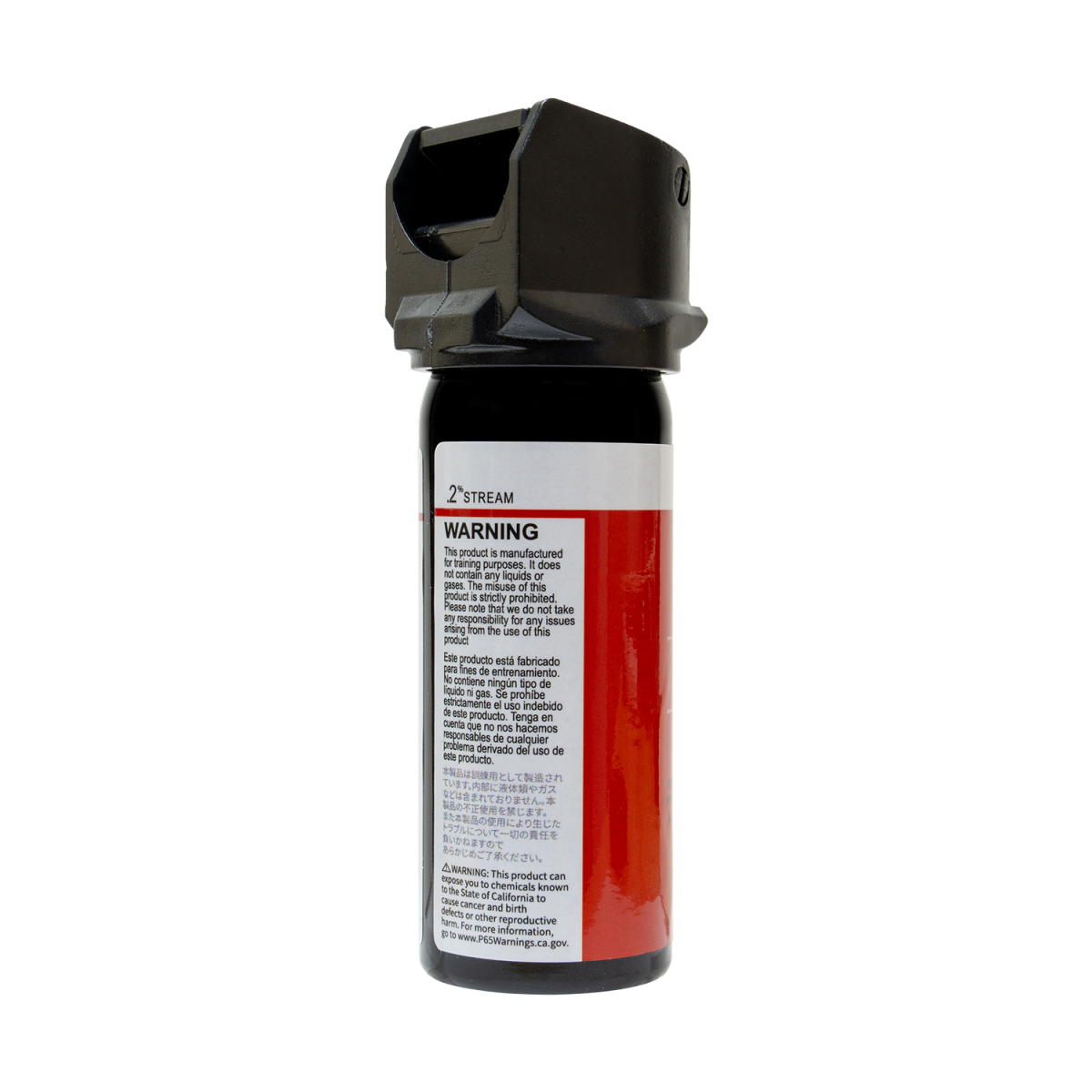 内部には液体やガスなどは入っていないため押しても何も出ません。そのためイベントなどへの持ち込みやお子様がいる自宅でも安全に取り扱えます。またラベルの端にはダミー・トレーニング用の製品であり液体などが含まれていないことが記載されています。