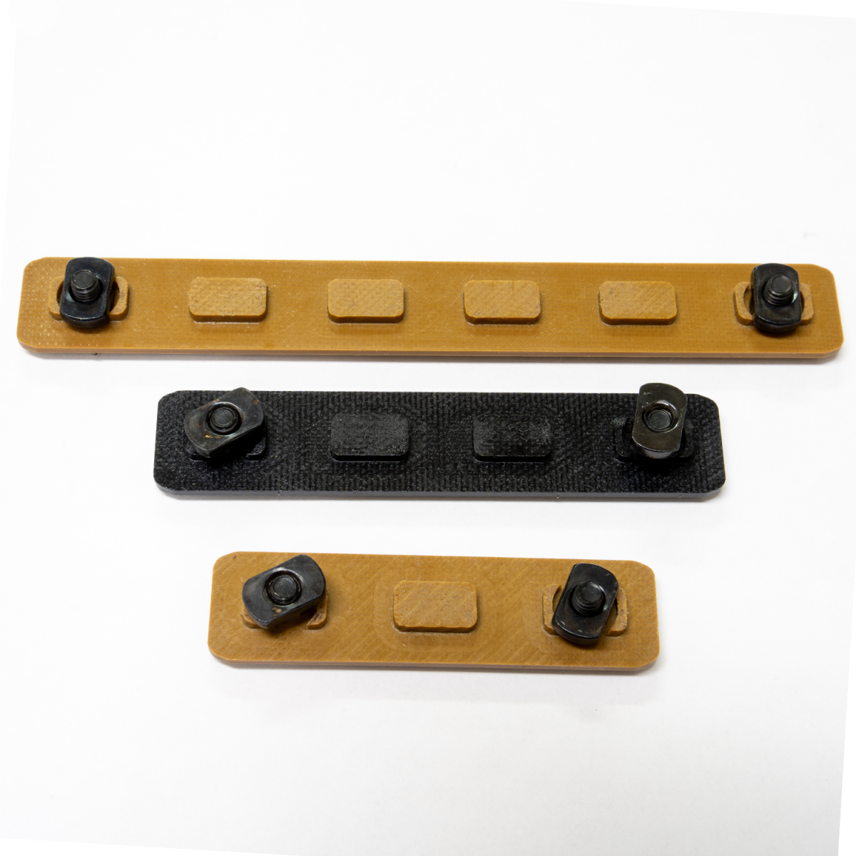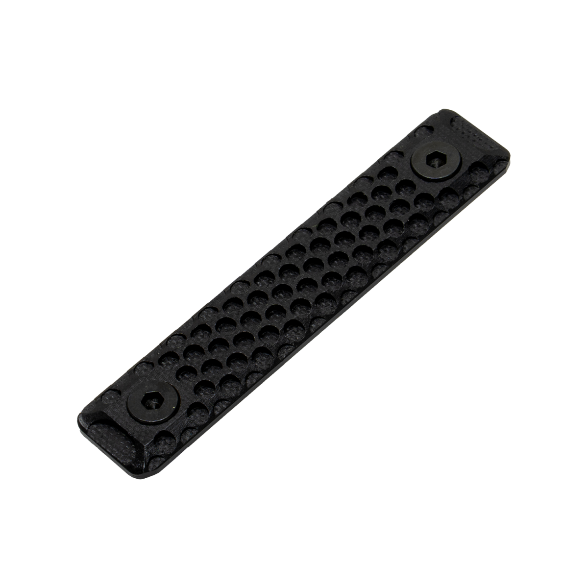 高級カスタムハンドガンのグリップなどにも使用される「G10」素材を採用した、M-LOK対応のレールカバーです。厚さは3mm(背面の突起部を除く)と非常にスリムで、装着しても全体のサイズ感を損なわず、適度なグリップ感を提供します。外装のディティールアップだけでなくハンドガードを傷や擦れから保護する役割も果たします。