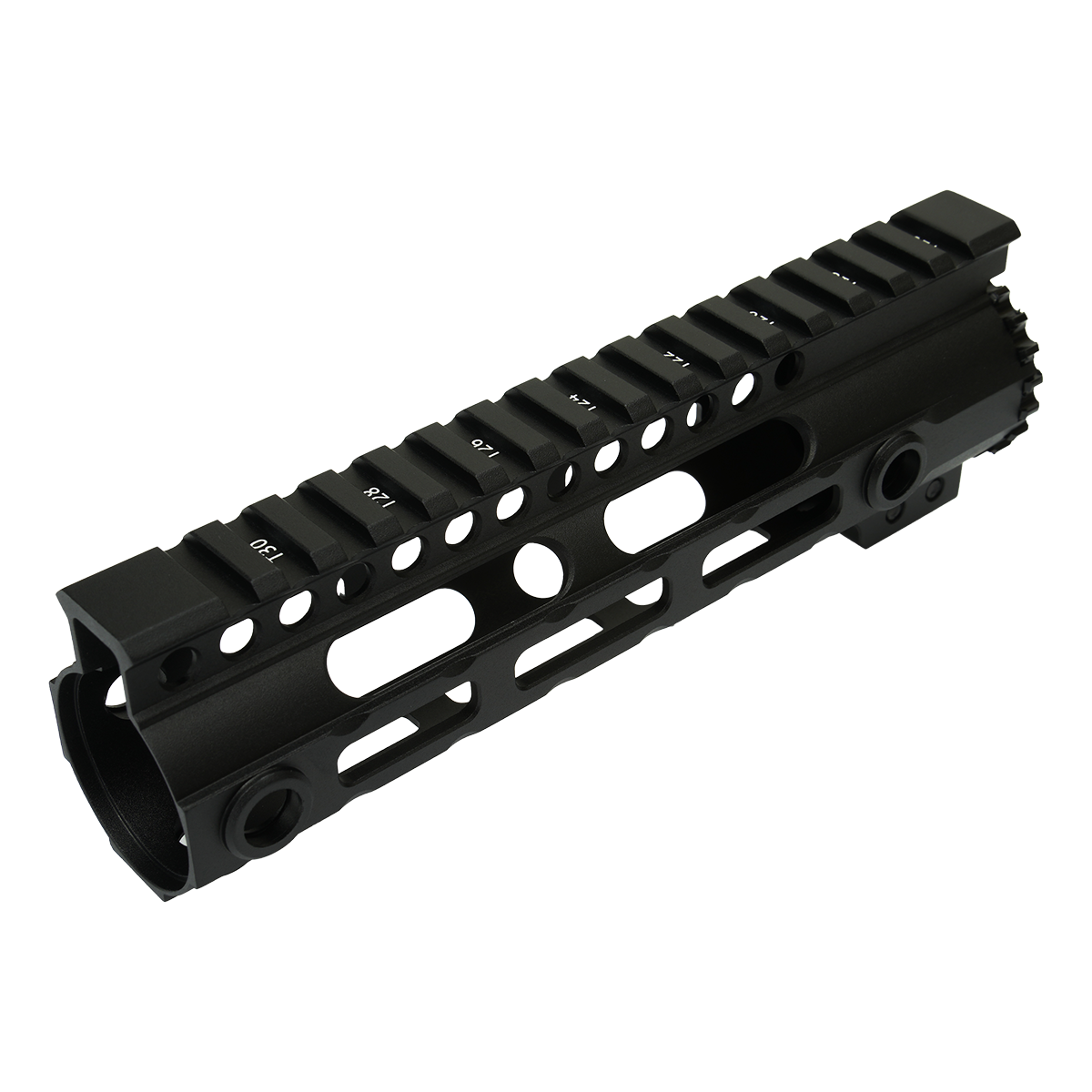左右と下部にM-LOKスロットが付いており、対応したグリップなどのアクセサリーが取り付け可能です。QDスイベルホールが5か所用意されておりスリングや使い手を選びません。