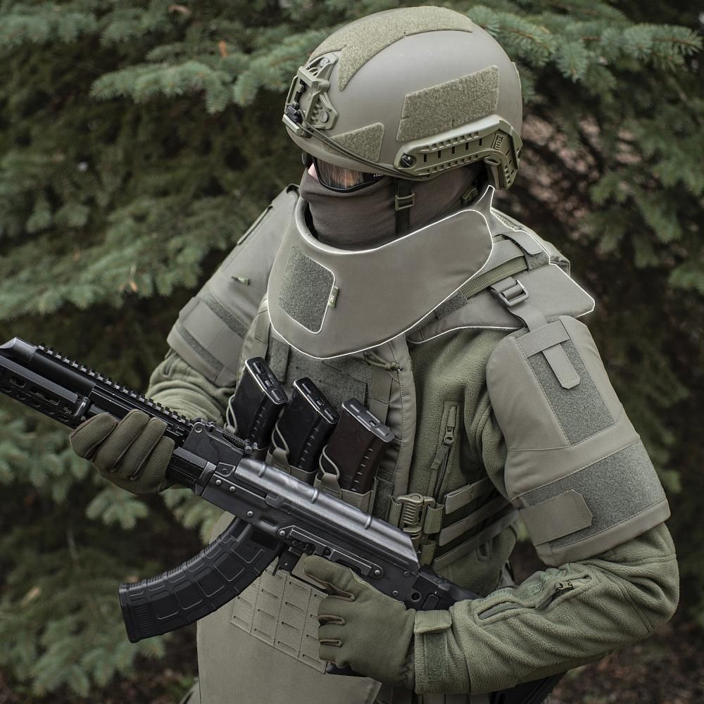 モジュールはベルクロ留め具付きの2つのパーツで構成されており、正面のネックプロテクターはQRSプレートキャリアの胸部パネルにあるMOLLEインターフェースに接続します。背面のショルダーセクションは両サイドのベルクロストラップでプレートキャリアのショルダー部分に固定されます。摩耗に強い500Dコーデュラナイロンで作られており、ショルダー部分の内側には圧力を軽減し通気性を向上させるクッションメッシュが施されています。