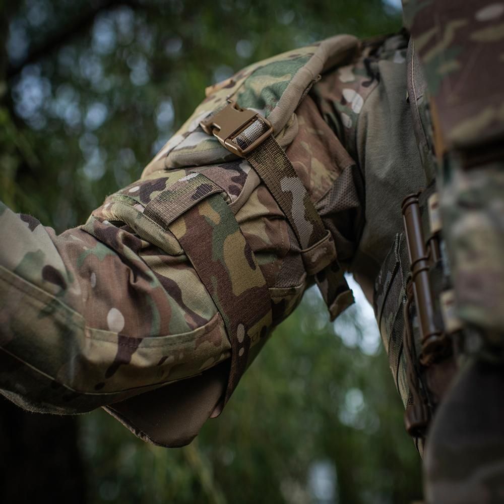 プロテクターはベルクロでプレートキャリアのショルダーセクションに取り付ける構造で、ストラップとプロテクターはロック機構付きのプラスチック製Dリングフレームで接続されている為、必要に応じてショルダーシステムを素早く取り外すことができます。接続部や腕の固定部のストラップは長さ調節が可能で、体格に応じて自由に調整できます。